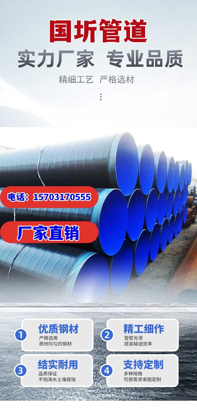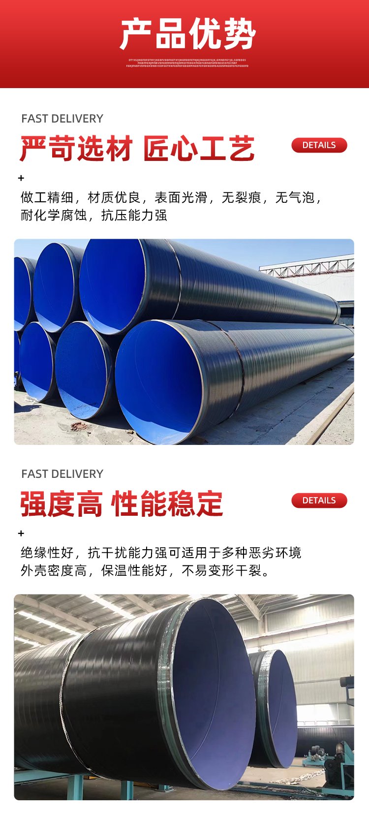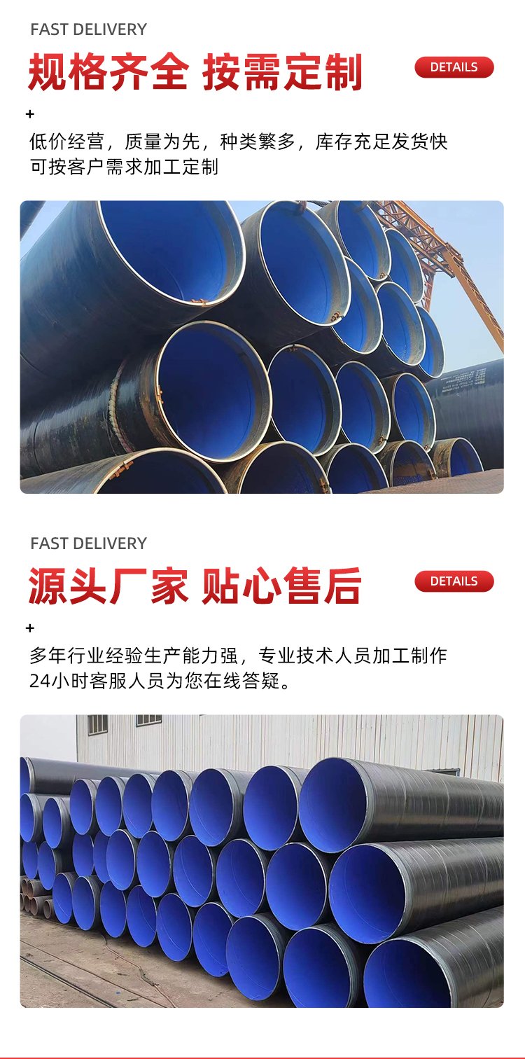 外 3PE 內環氧粉末防腐螺旋鋼管的防腐性能強主要得益于外層的 3PE 涂層和內層的環氧粉末涂層的共同作用。外層的 3PE 涂層具有良好的密封性和抗滲透性,能夠有效隔絕空氣、水分等腐蝕介質,防止鋼管表面發生氧化反應。同時,聚乙烯材料分子量大、穩定性好,能夠在各種惡劣的環境下保持良好的性能。內層的環氧粉末涂層則具有很高的耐久性,能夠抵御腐蝕介質的滲透和侵蝕。環氧粉末涂層通過化學反應與鋼管表面形成牢固的結合,具有很好的附著力和耐化學腐蝕性。此外,環氧粉末涂層還具有良好的絕緣性能,能夠防止電化學腐蝕的發生。據相關數據顯示,外 3PE 內環氧粉末防腐螺旋鋼管的防腐性能比普通鋼管提高了數倍甚至數十倍,能夠有效地延長管道的使用壽命。