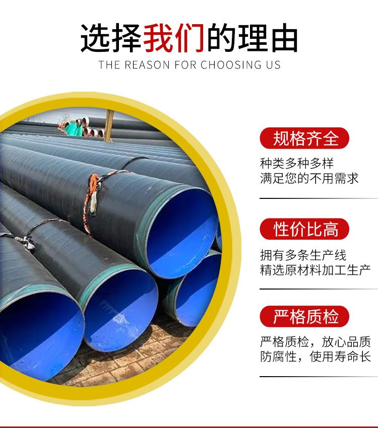 外層的 3PE 涂層在高溫環境下能夠保持防腐性能和耐久性,主要有以下幾個原因。首先,3PE 涂層中的聚乙烯材料具有較高的熔點和熱穩定性,能夠在高溫環境下保持良好的性能。其次,3PE 涂層中的粘合劑能夠在高溫環境下保持良好的粘結性,確保涂層與鋼管表面的牢固結合。此外,3PE 涂層還具有良好的隔熱性能,能夠減少外界高溫對鋼管的影響。在實際應用中,外 3PE 內環氧粉末防腐螺旋鋼管能夠在高溫環境下長期穩定運行,適用于石油、化工等高溫工業領域。
